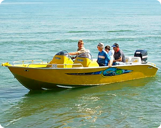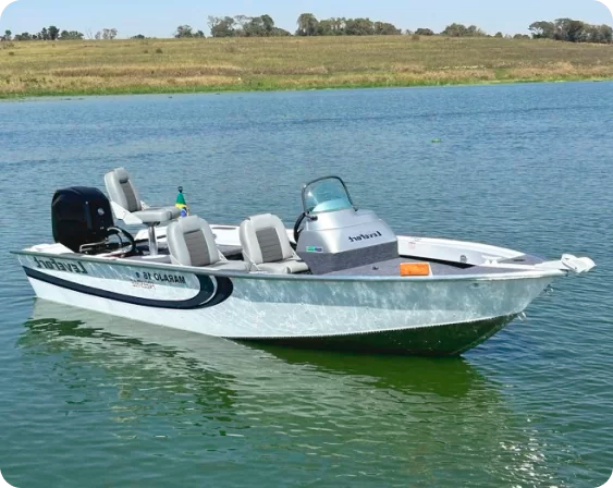 Barco versátil, conta com 5 bancos ergonômicos. Utilizado para pescarias e também para passeios em família. Navega extremamente bem em condições de vento.
