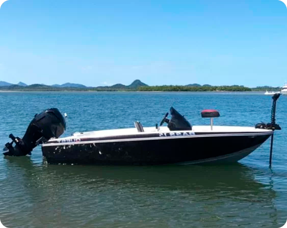 Com capacidade para 2 passageiros e motorização de 60HP. Possui suporte para âncora, viveiro para iscas e caixa térmica. Excelente para a prática de pesca.