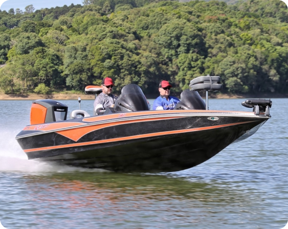 Barco padrão bass boat para motores de popa de 25 a 115HP. Conta com caixas e compartimentos para guardar materiais de pescas com segurança.